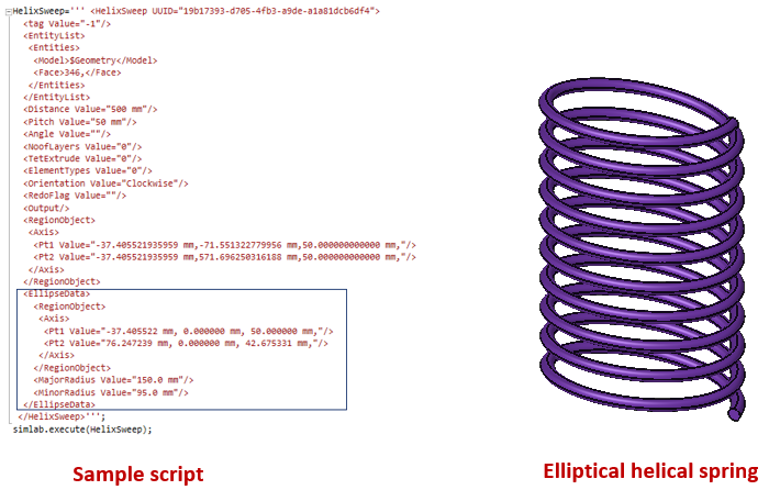 Note: Helical spring is supported for CAD Parasolid models imported with Save geometry in database option. Also elliptical helical sweep is supported for Parasolid and the ellipse data can only be given through script. Please refer below examples for better understanding.