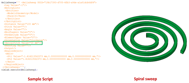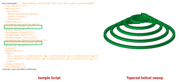 Tapered and helically swept bodies can be created through script with the same parameters as in helical sweep. Here, both pitch value and spiral pitch value must be entered as shown below.