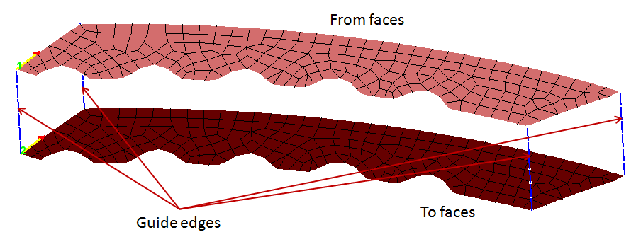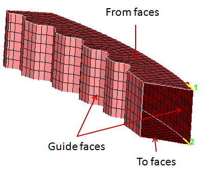 This option is used to sweep one set of faces to another set following the mesh profile of guide faces or edges. Both entities should have the same mesh patterns. An arrow will be displayed at both From and To faces. This specifies the direction to map the mesh between the two set of faces. The arrows should point in the same direction, otherwise use Flip Direction to correct it. Similarly the start point of the arrows should match, if not pick the corresponding matching point (node or vertex) on the To Faces. This option also supports CAD Parasolid faces for the model imported with save geometry in database option enabled. For CAD sweep, both From and To face should have same number of vertices.
