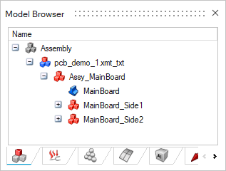 This tool helps to organize the PCB and its connected devices. Parts that completely enclose inside the PCB and on the same side get grouped to Side1 and Side2 named sub-models. Other parts get grouped to a sub-model named Adjacent. Users can easily do further operations by using this sub-model.