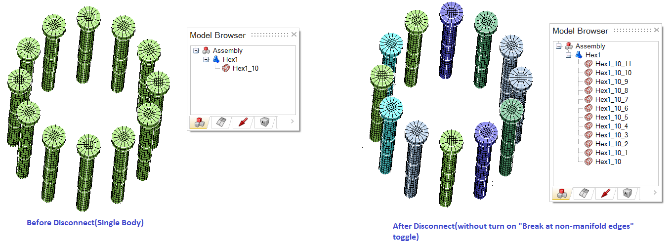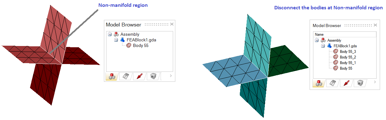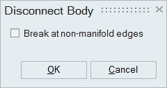 This tool is used to separate a body that contains many topologically connected regions into individual bodies. By default, bodies are disconnected based on topology. However, by selecting Break at non-manifold edges, you can disconnect bodies at non-manifold edges.