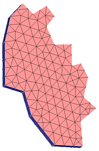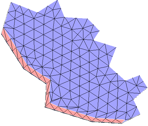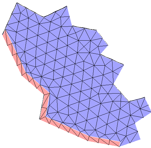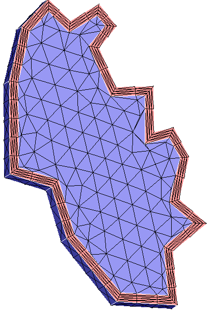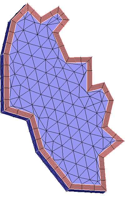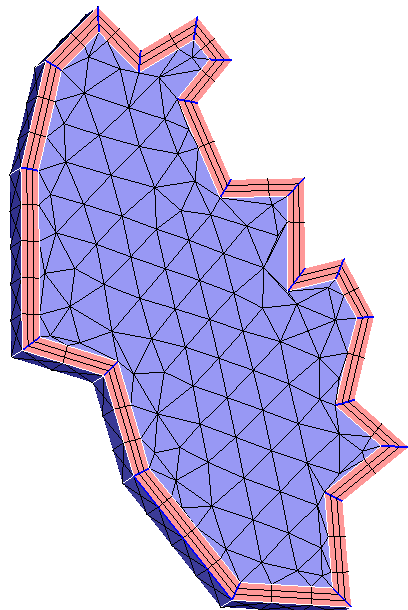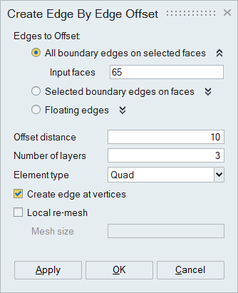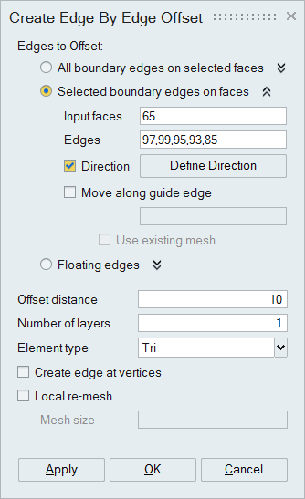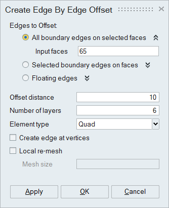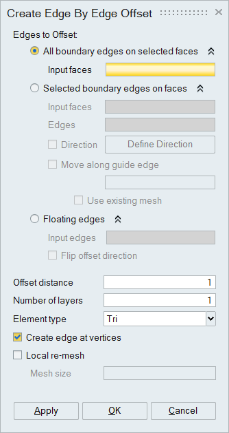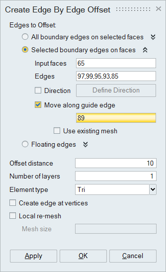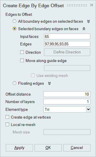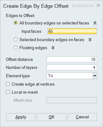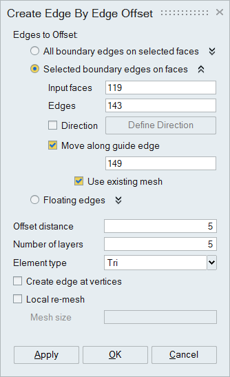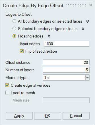 Select a floating edge. Specify the offset distance as 20, Number of layers as 5, select Tri element type and click OK.