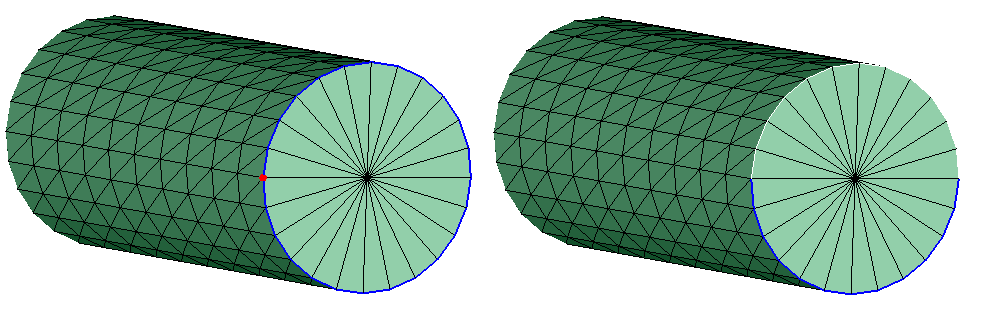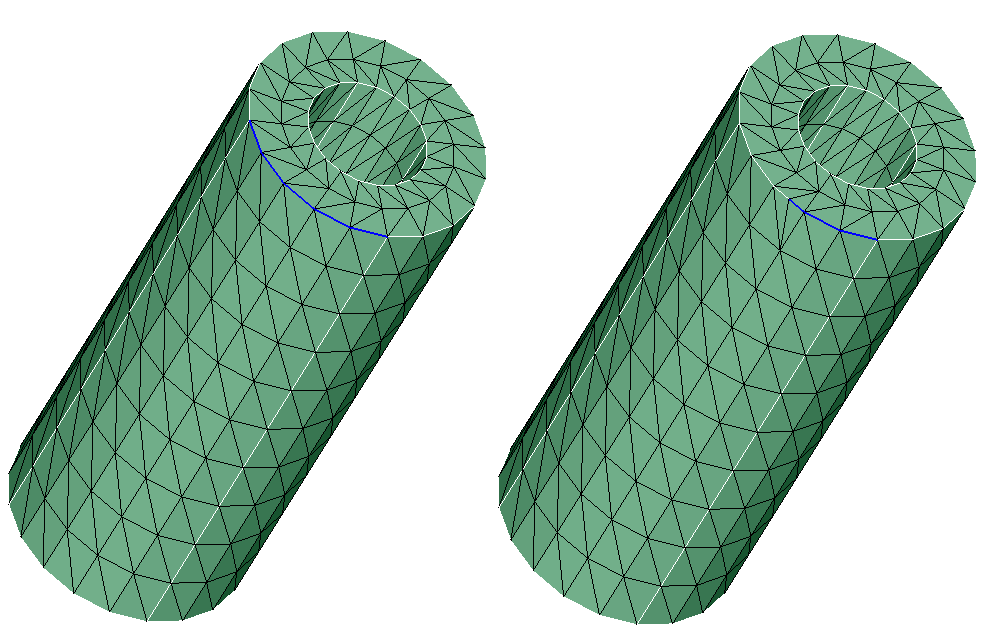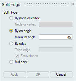 This option is used to split the edges in bodies or faces based on angle. Individual edge can also be split in this method. Bodies/faces/edges from a model is selected and the minimum angle is mentioned (Default: 45 degree). All the edges whose included angle exceeds the given value will be split.