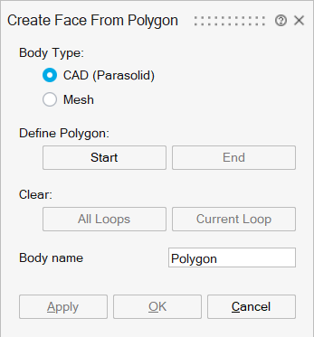 This tool allows you to create a polygonal face as sheet bodies using a closed set of points. The points can be selected with nodes, vertices, or a combination of both.