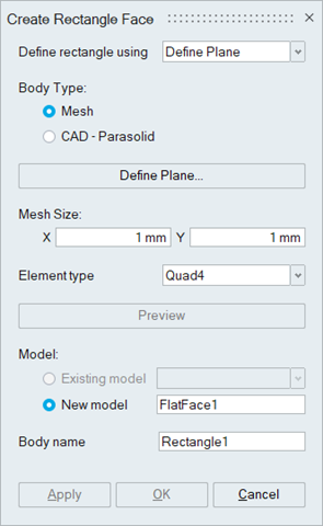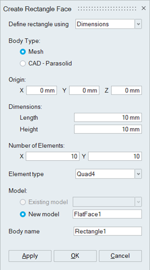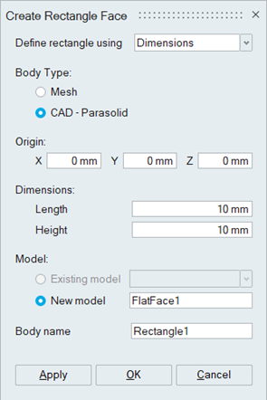 This tool is used to create a rectangular Mesh or CAD Parasolid face.