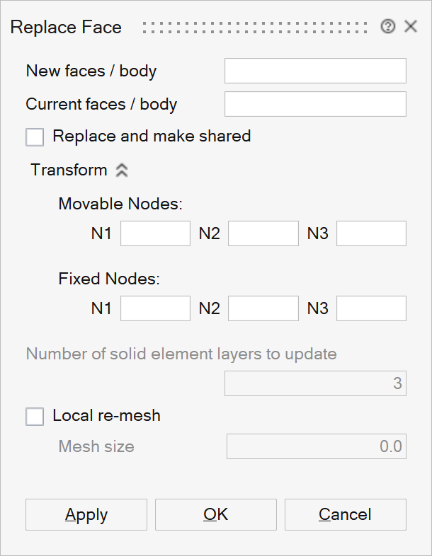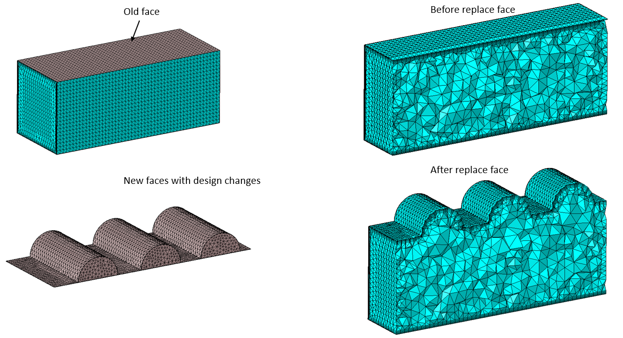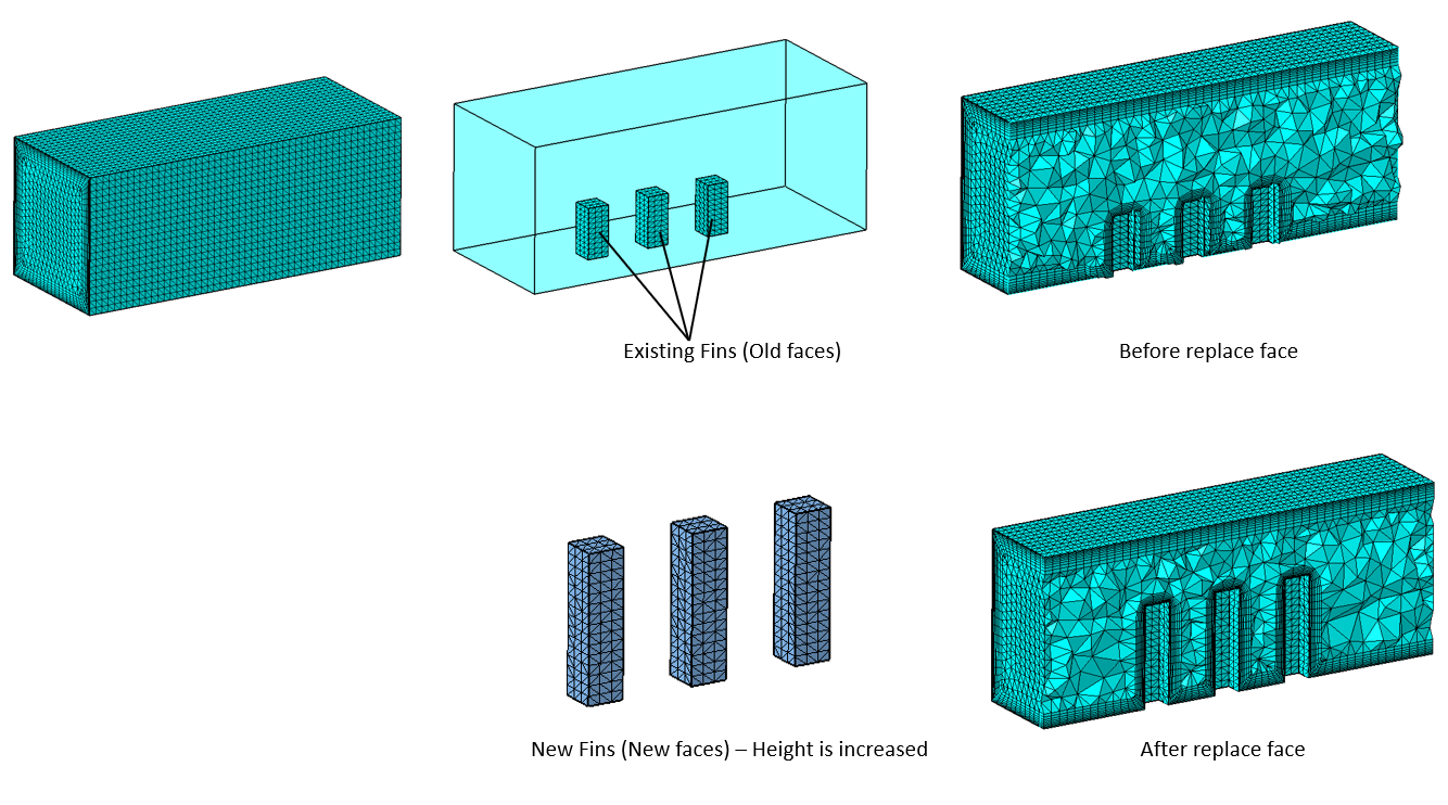 The given number of solid element layers connected to the current faces will get modified with the replace operation. If the geometry of the new faces doesn't match with the current faces, then the solid elements to be modified will get identified automatically.
