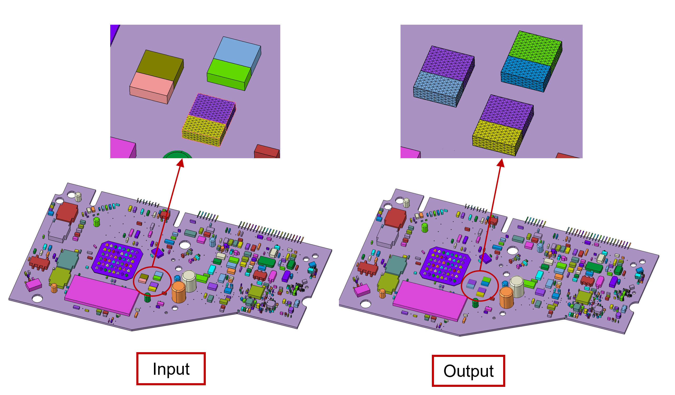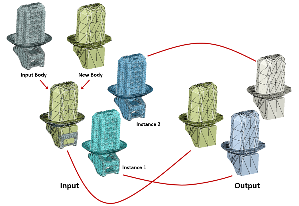 This tool replaces the instances of the selected CAD body with another CAD/Mesh body. For mesh body input, the identical bodies are identified as instances and get replaced. The comparison for identical involves physical properties such as surface area, volume, and principal moment of inertia.