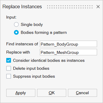 • It replaces a similar group of CAD bodies with the given CAD or mesh bodies.