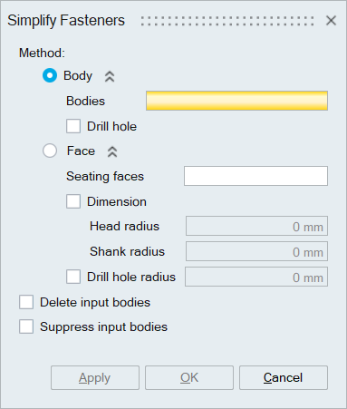 This method gets bodies as input. It calculates the dimension parameters by itself and tries to simply the fasteners. But user must filter the fastener bodies and give as input.