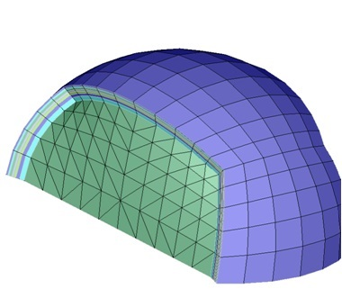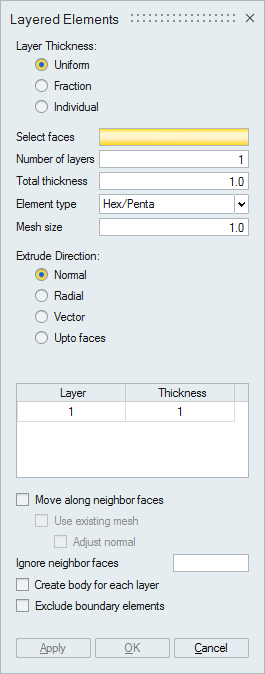 The Layered elements tool can be used to create a layer of tetrahedron, penta or hexahedron elements from the given faces for the specified magnitude. We can give the faces from solid body also. When give faces from shell body, it split the body into two. One body contains volume mesh(layered elements) and the other body contains the shell faces.