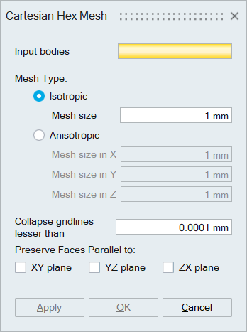 Based on the selected combination of XY YZ ZX planes, the shape of the planar faces in the input bodies parallel to global XY YZ ZX planes are retained in the output mesh if only if the specified “Collapse grid line lesser than” value is satisfied.