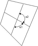 The warpage of a QUAD element is calculated by splitting the QUAD into two TRIs and finding the angle between the two planes formed by the TRIs. The QUAD is then split again, using the opposite corners, forming the second set of TRIs. The angle between the two planes formed by the second set of TRIs is found. The maximum angle found between the planes is the warp angle of the element.