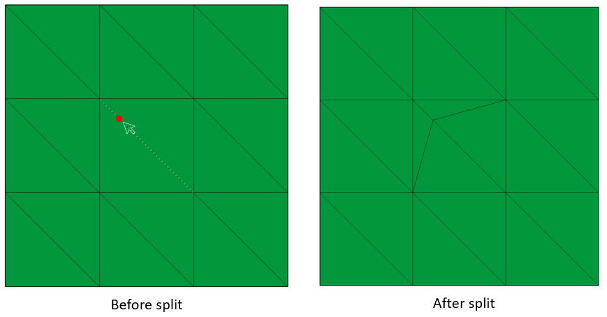 Hovering on an element edge highlights a node position at the cursor location. On clicking, the split happens at the highlighted node position.