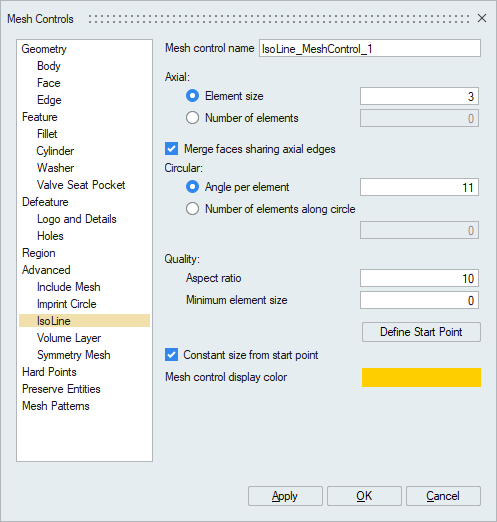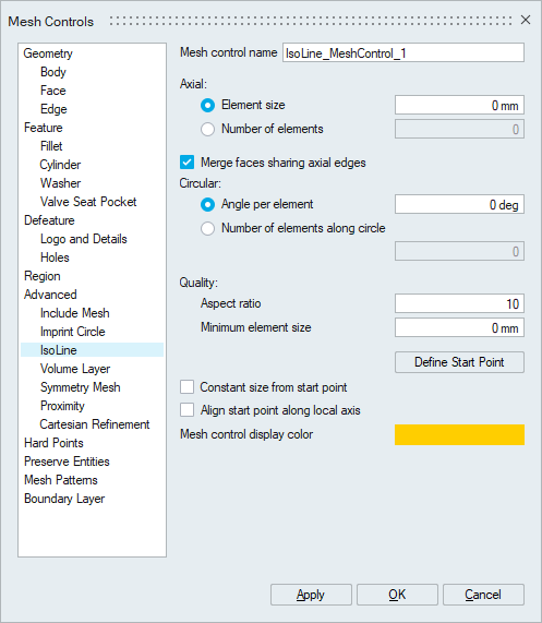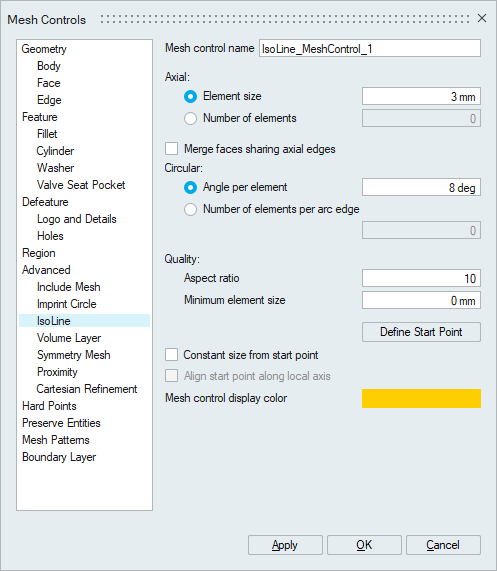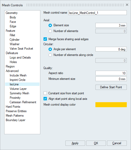Iso-Line Mesh Control is for placing mapped mesh (90 degree triangulation) on cylindrical \ conical faces that are trimmed (with cutouts and non-circular boundary edges) / non trimmed (with four sided faces and circular edges defining the boundary). The mapped mesh is created for a given size/seed in axial and circular directions.