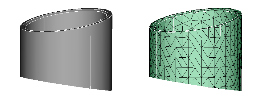 In the output we can observe the non uniformity of size near the edge at highlighted area. This is because the face has a circular span that is not a multiple of 8 degrees. So the last segment is less than 8 degrees and so appears non-uniform. Note that the cylinder is made of 4 separate surfaces.
