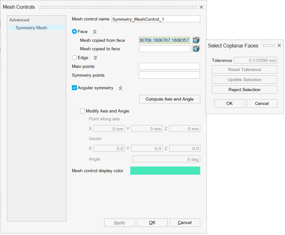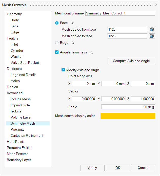 - If all the bodies with symmetry mesh control are transformed or any CAD operations are carried out and if the “Modify Axis and Angle” check box is ON, the values of “Point along axis”, “Vector”, “Angle” will be automatically updated for CAD input.