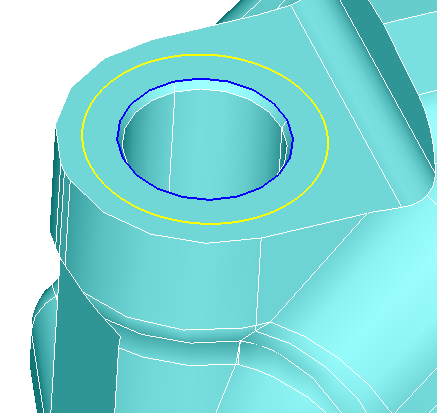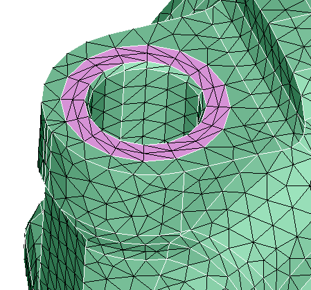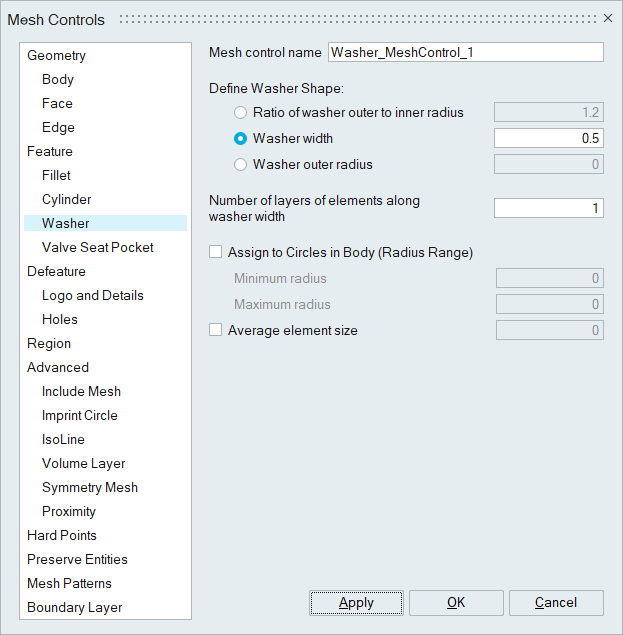 This option is used to apply the washer mesh control to a body. The circular edges within the specified minimum and maximum radius range in the selected body will have the washer mesh control applied to them. Using Right Click | Select Features , the list of edges for which the washer mesh control will be applied can be cross-checked.