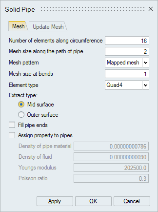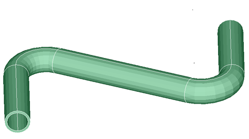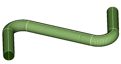 Mid or outer surface mesh of pipes can be created automatically from CAD body using this tool. Mid or outer surface mesh will be created using "Mesh size along the path of pipe" and "Number of elements along the circumference". "Mapped mesh" pattern will create 100% Quad4 or Tri3 elements based on the user defined element type on the mid or outer surface for pipes and hoses. Bends of the pipe can be meshed with finer mesh size using "Mesh size at bends". The pipe ends can be filled using the option "Fill pipe ends". This tool allows to assign material to the pipe mesh. If the fluid density is to be included for analysis, specify the fluid density and the software will adjust the pipe density to include the fluid mass.| Input | Output |