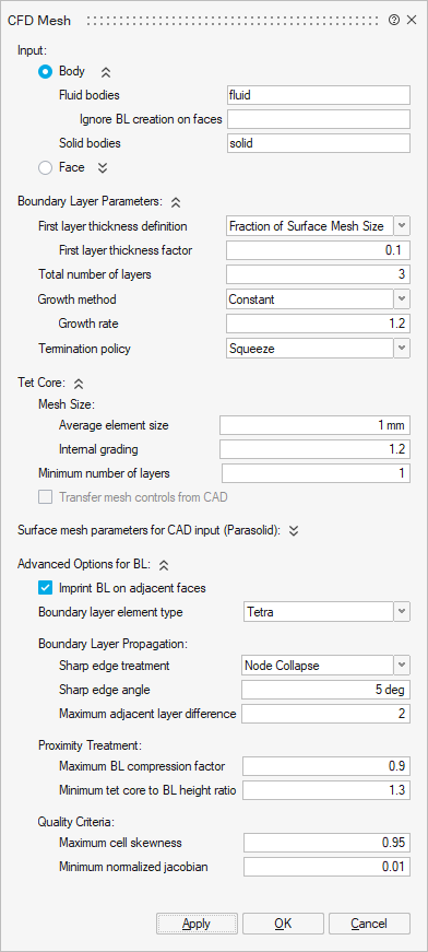 - Fraction of Surface Mesh Size: The first layer height for each element equals the average element size multiplied by the given factor. This option is useful when the mesh size of 2D elements varies significantly and a constant first layer height is not needed. A smooth BL to tetra mesh transition for all elements can be achieved by using this option.