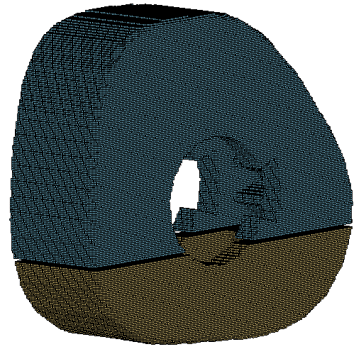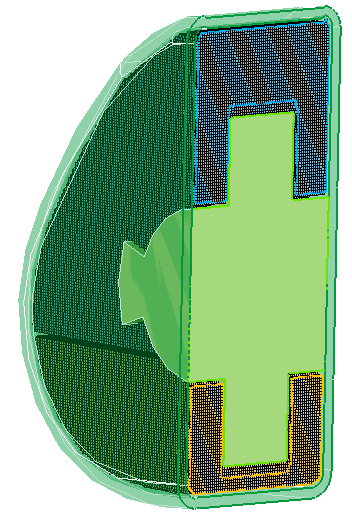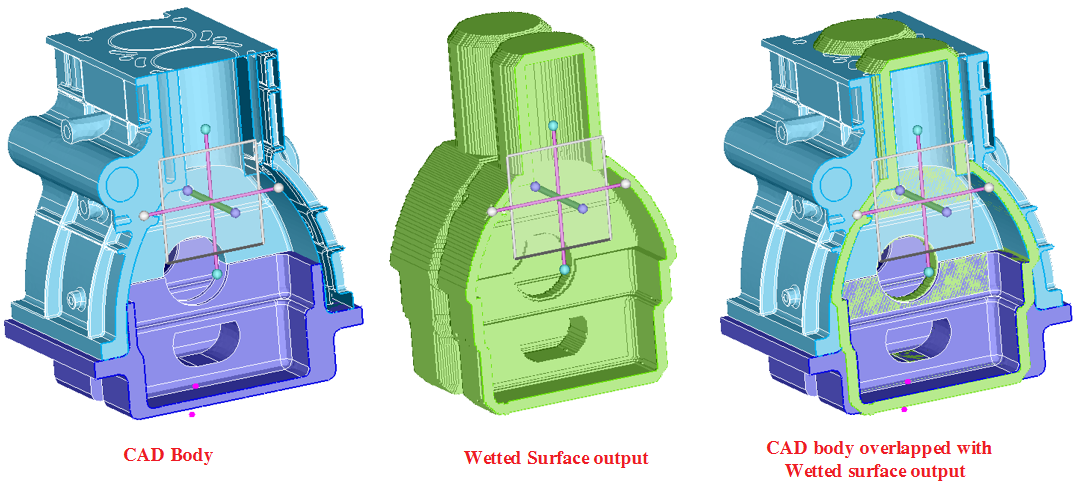 Sometimes the outer casing can have features like bolt holes, ribs, etc. which do not impact the solution. It is more efficient to generate the model without these features. This is achieved by identifying solids that define the container (should not include the moving parts and should be closed: should not have gaps bigger than the particle distance) and a point inside the container where the fluids are present. The software will identify the wetted surface (surface that is touched by the fluids) and create several layers of particles away from the wetted surface. A free node inside the fluid and a required number of layers of particles should be specified. The wetted surfaces for the liquid will be automatically identified.