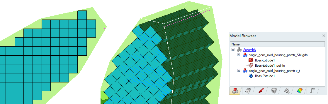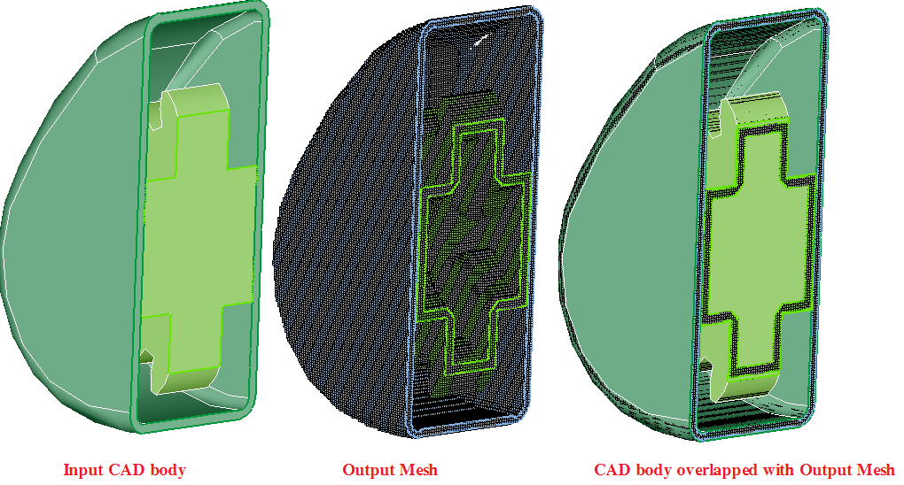 This option is used to generate a uniformly distributed particle for the nanoFluidX (nFX) solver. The particles form a grid in the global XYZ axis with one point at the origin. The output from this operation is a HEX mesh. The SPH particles are the nodes that define the hex elements.The input geometry can be CAD or FE models.