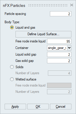 This option help create particles for the gears, shafts, or casings which are solids. Particles will be created inside the solid region. To reduce model size, users can model the solids as a thick solid (hollow inside) without impacting the results. To facilitate this, users can specify a finite number of layers of particles needed from the solid surface. If the number of layers is specified as 0, all the particles inside the solids will be created. This can also be used for liquid or gas regions modelled as solids in the geometry.
