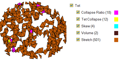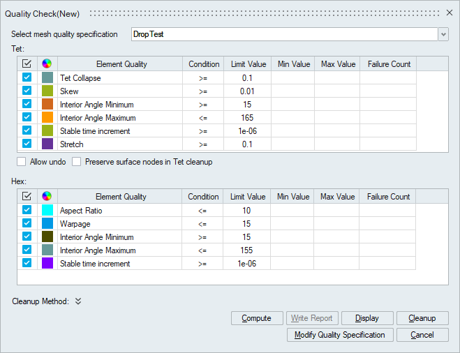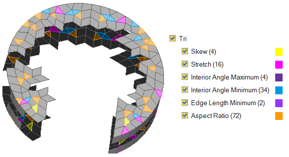Using the selected mesh quality specification, quality measures are displayed based on element type. Both shell and solid elements are supported for multiple quality computation, display and cleanup.