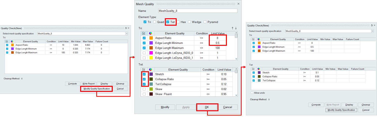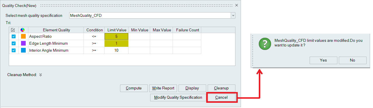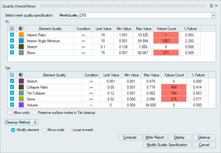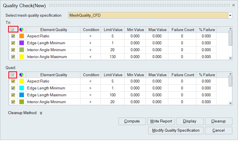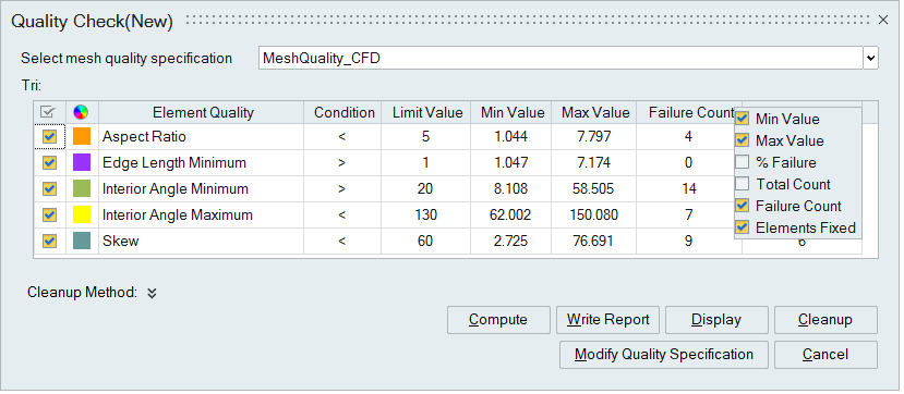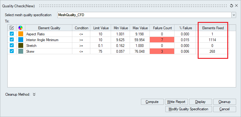 In selected Mesh quality specification, automatic cleanup can be done based on the quality measure selected by the user. Cleanup is supported only for the following quality measures:
