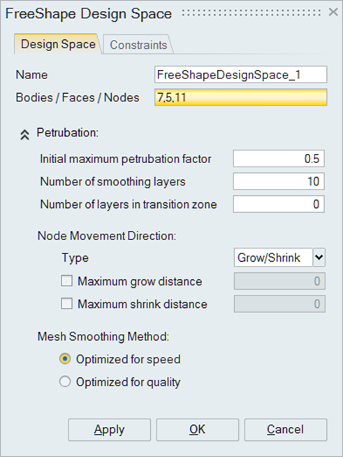 - Select the faces / bodies / nodes, whose nodes are to be considered for Free shape optimization. If bodies are selected only the surface nodes will be used for optimization.