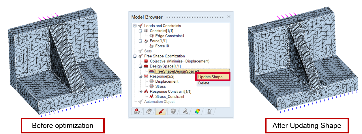 Update Shape option is available at right click of free shape design space tree item. The Update shape option is used to import the *.grid files from free shape optimization result and update the shape of the model.This is present only in classic approach.