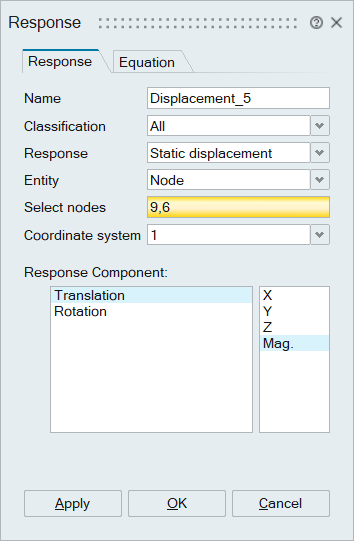 • User can create responses (DRESP1), by selecting multiple entities (nodes, elements and surfaces). When it is referred in the equation response as a vector-based input, it will be treated as a separate response for each entity. This will avoid the creation of multiple responses.