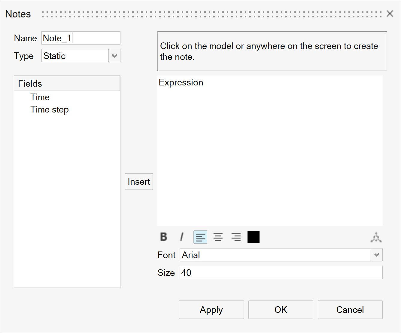 2. Select an available field from list on the left, then click Insert Field to add it to the note. For the time field, define the precision and format.