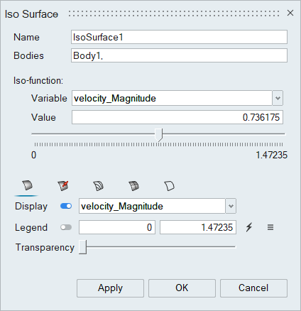 Use the Iso-Surfaces tool to create a derived geometry surface with a specific constant scalar value and define display properties. The shape of the iso-surface is dependent on domains and flow fields.