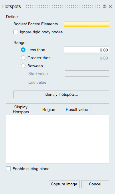 This tool is used to identify results regions for given threshold limit (above, below, within range) by specifying which entity (i,e. bodies, faces, and elements) needs to be identified. The results region will be found for the entire model if no input is provided.