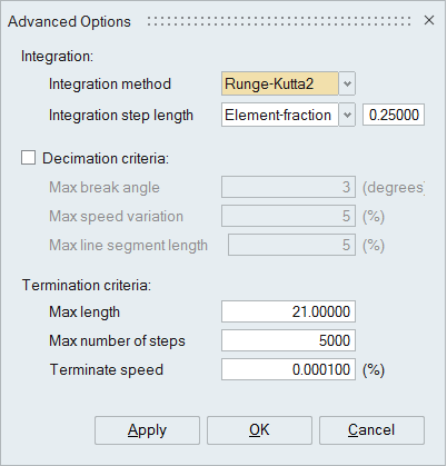 The Advanced Options dialog allows you to specify a number of parameters which control how the streamlines are generated. From the streamlines dialog, click on Advanced button.