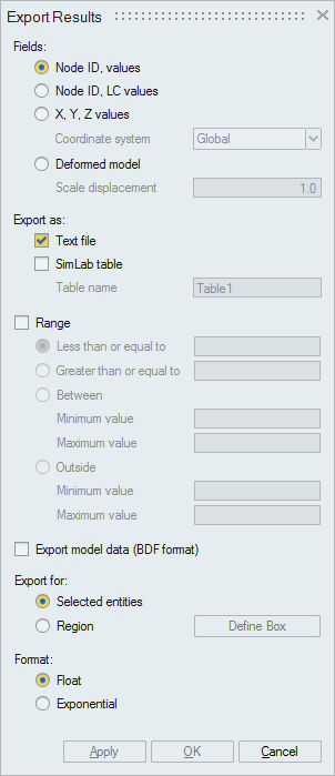 This option enables the user to export the result values for each node. Either result can be exported along with the node Ids or with the coordinates of the nodes. Bodies/faces/edges/vertex/elements/nodes can be selected and result for these selected entities will be exported. If no entity is selected then all nodes from the model will be exported.