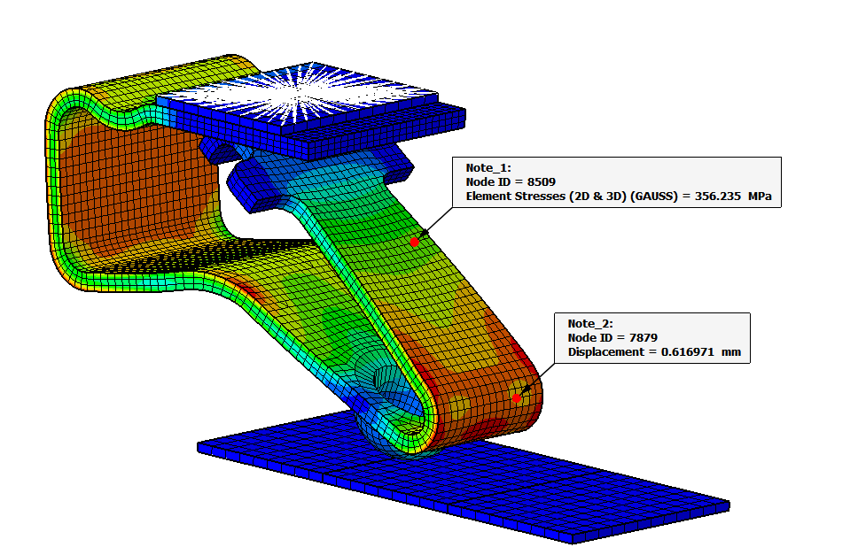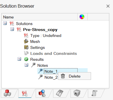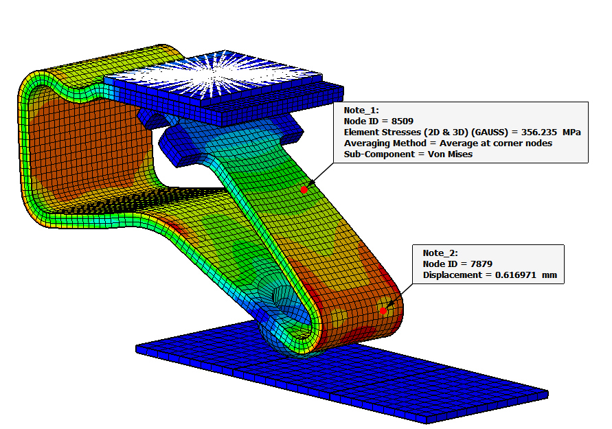 - To create a Note, pick a node or an element on the model and click the Notes tool from the Result ribbon. A Note can also be added using the “Create Note” option in the GUI right-click menu.