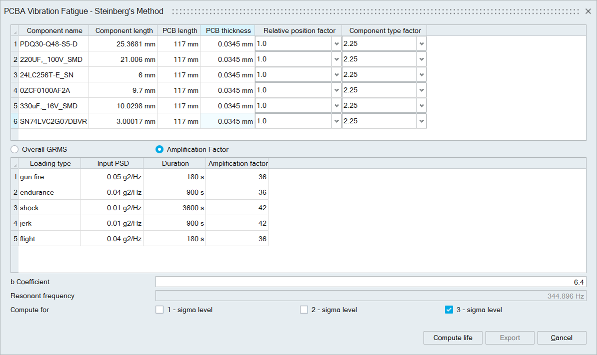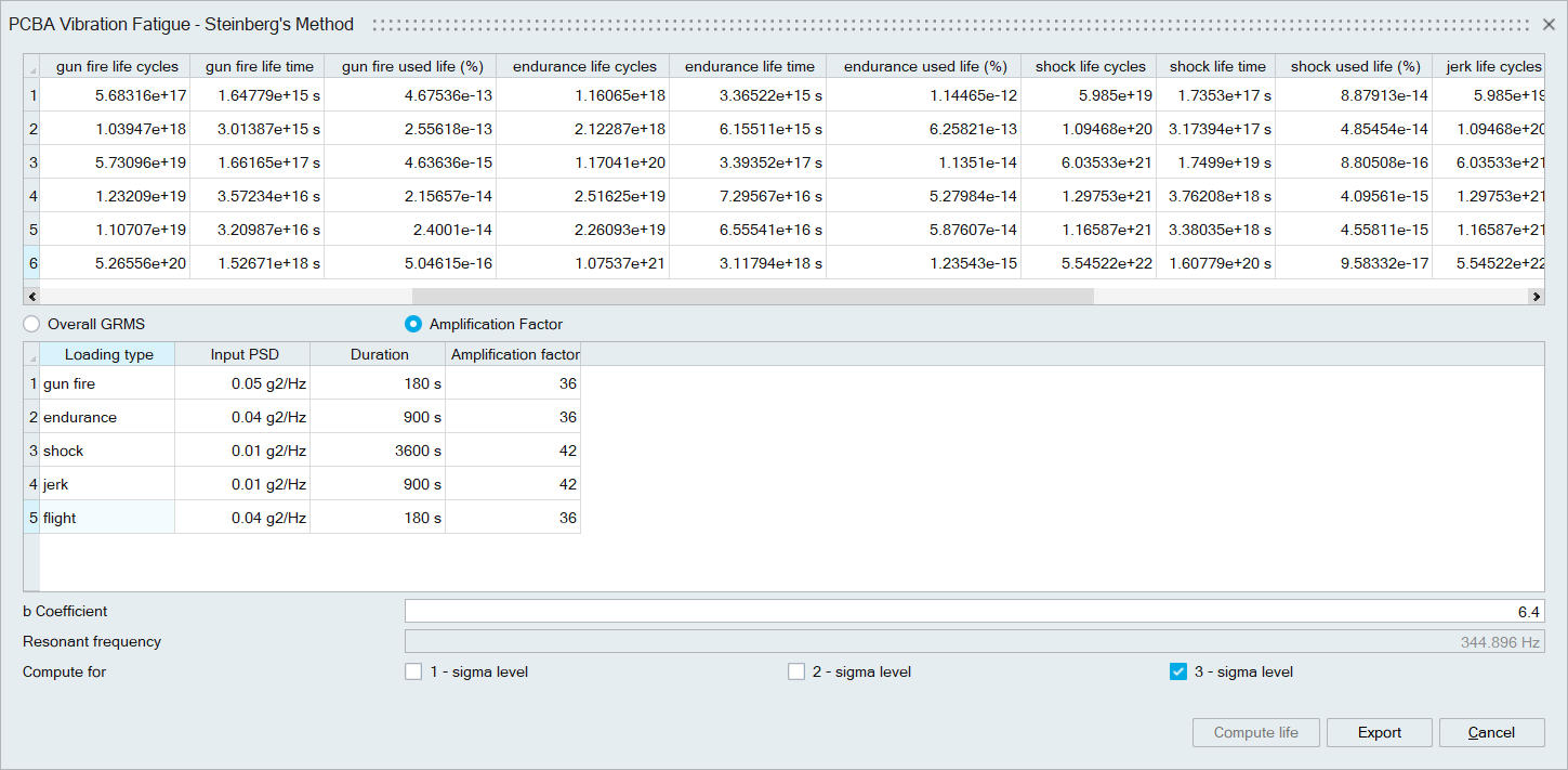 The relative displacement based on the Steinberg model and the normal mode result is calculated. With that ratio, the fatigue life of the component is computed and updated in the dialog.
