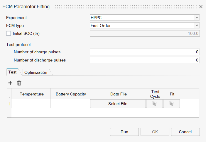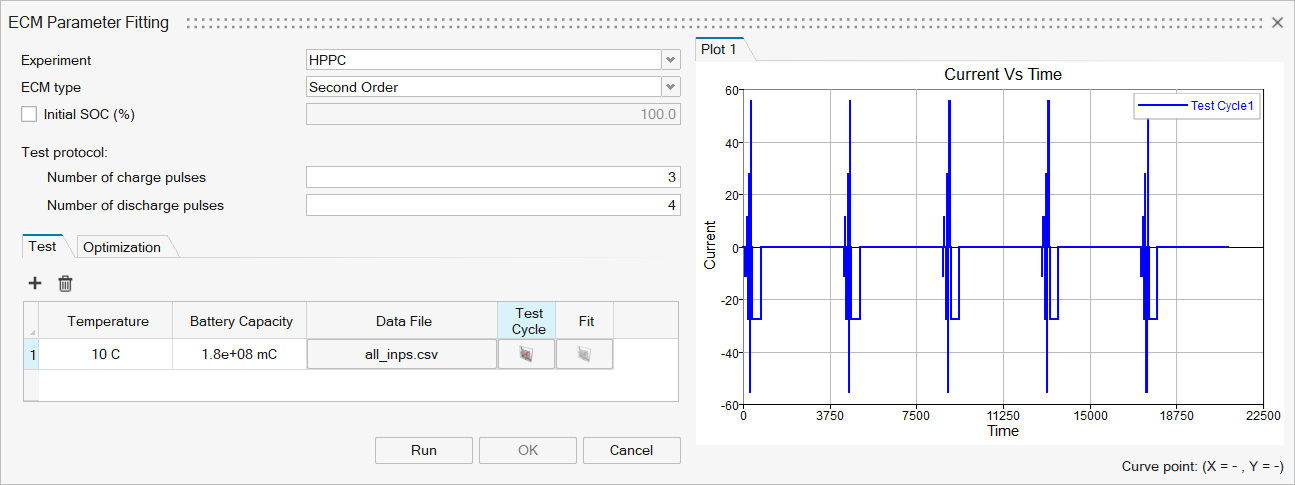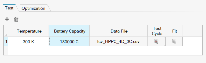 The Test tab allows users to input data for the full HPPC test across multiple cycles. The figure below illustrates the input for a single test. Multiple tests conducted at different temperatures can be added or removed depending on the available dataset.