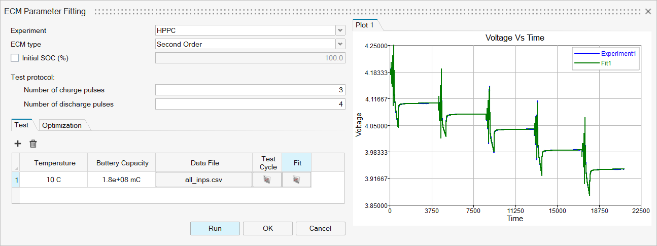 The ECM Parameter Fitting tool provides an interface to fit ECM models up to third order using transient current and voltage data from pulse-discharge/charge experiments, such as Galvanostatic Intermittent Titration Technique (GITT) or Hybrid Pulse Power Characterization (HPPC).