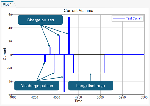 A single cycle of an HPPC test illustrating charge pulses, discharge pulses, and a long discharge step for SOC reduction. Periods of zero current indicate rest intervals between pulses. In the above there are three charge pulses and four discharge pulses.