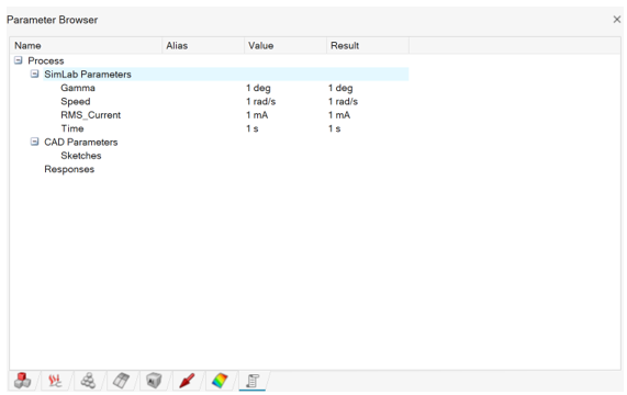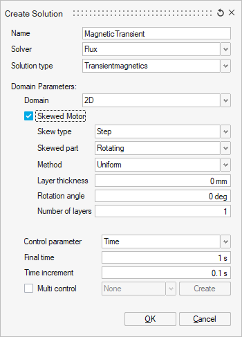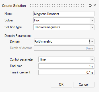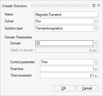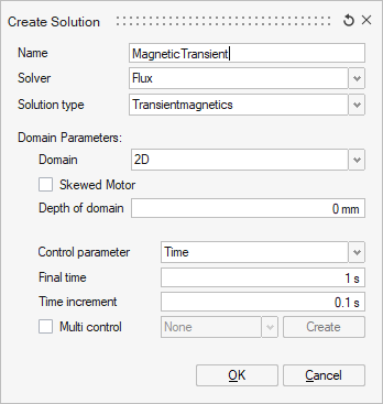 This parameter can be used to define transient quantities like current or voltage waveforms eg. I1 = MAX_CURRENT*SIN(OMEGA*Time+Gamma*PI/180).Note: The parameter does not reflect the actual values defined in the solution but only default values. - Creation of the the motion load named for instance Motion_1 now