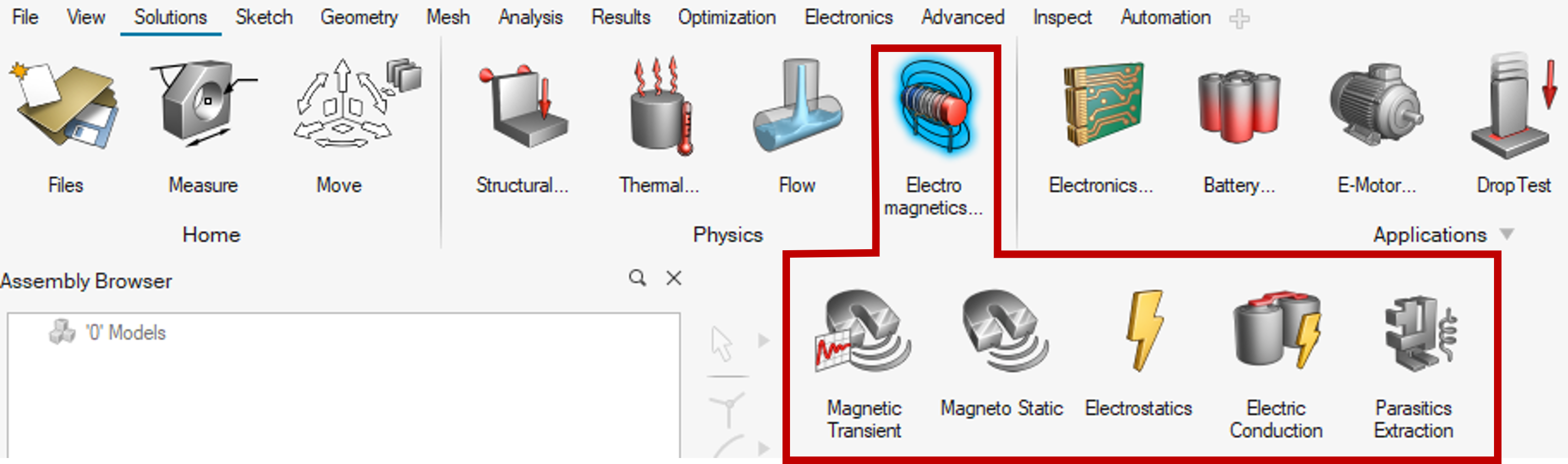 User must select the appropriate physics in the solution panel. Accordingly, boundary conditions, solution parameters, material creation and assignment will be automatically setup to run an electromagnetic solution, launch the solver and visualize the results.