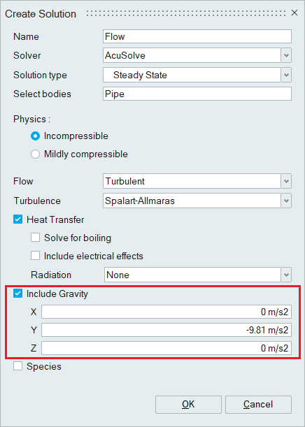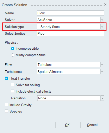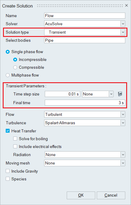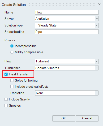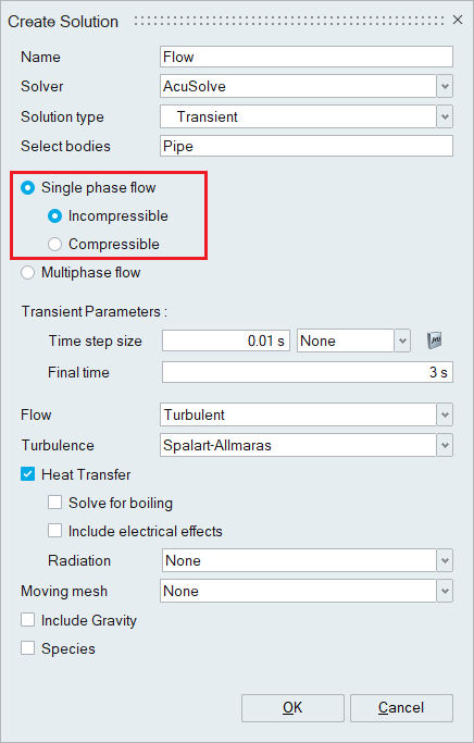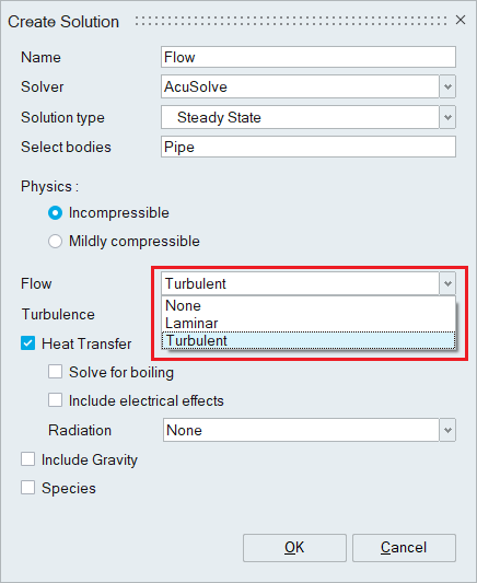 Flow must be set to None, when there is no flow being modeled in the simulation. This option can be used for Frozen flow simulations where the flow variables are mapped as initial conditions and not solved during the simulation. This option can also be used for modeling heat transfer through solid bodies.