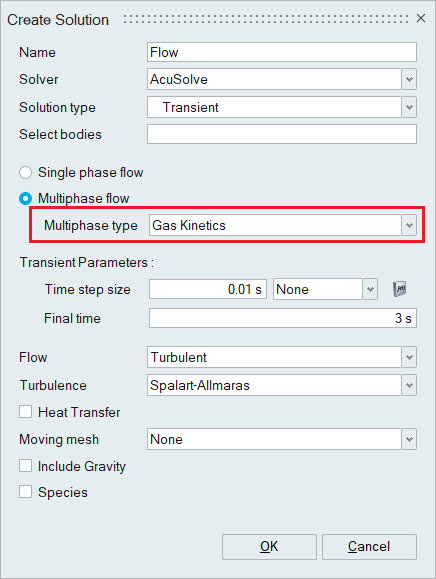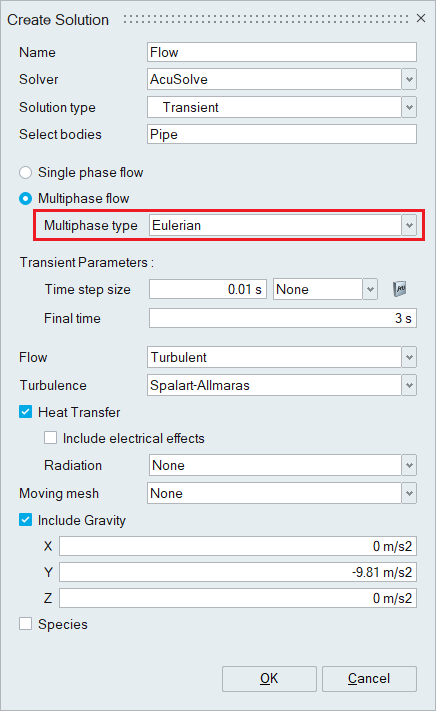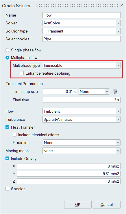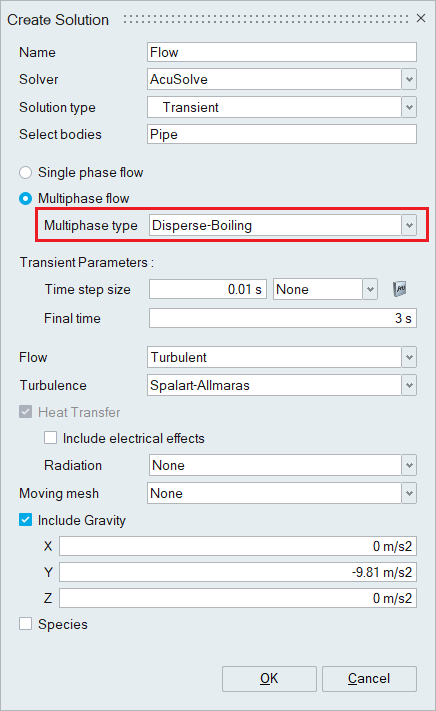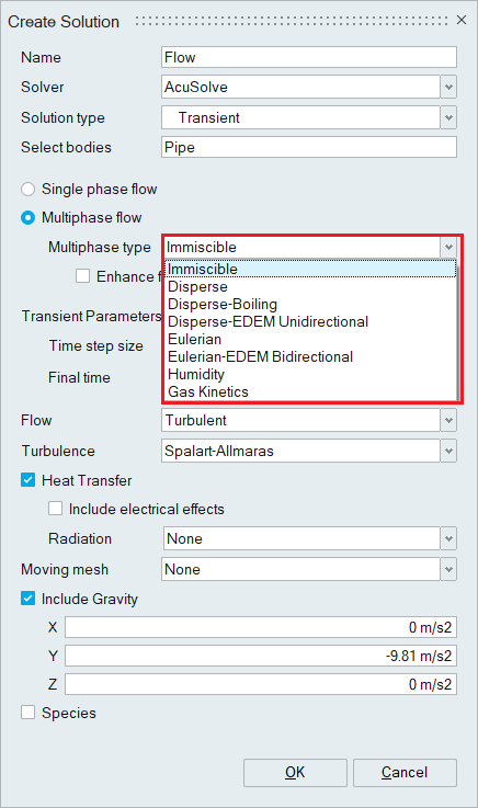 In general, multiphase flow are mainly observed in real life environment consisting of two or more fluids (gas, liquid, or solid). They have possible combinations of gas-liquid (dissolved gas), liquid-liquid (oil in water), liquid-solid (immersed particles), as well as gas-liquid-solid. Multiphase flow is valid only for transient analysis.