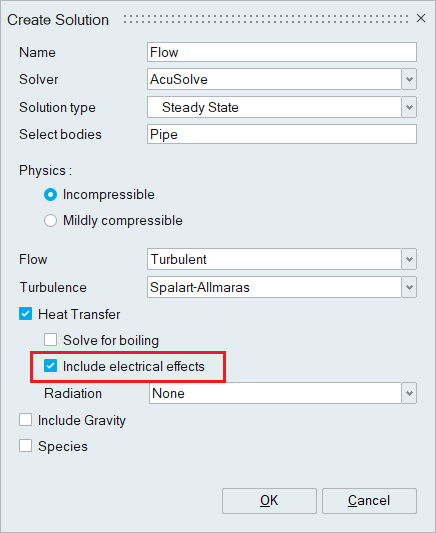 If “Include electrical effects” is activated, Joule Heating is modeled. Joule heating is the physical process by which the passage of electrical current through a conducting material produces heat. And electrical energy is converted to thermal energy. Current and Voltage are taken as inputs in the simulation.