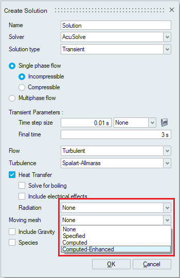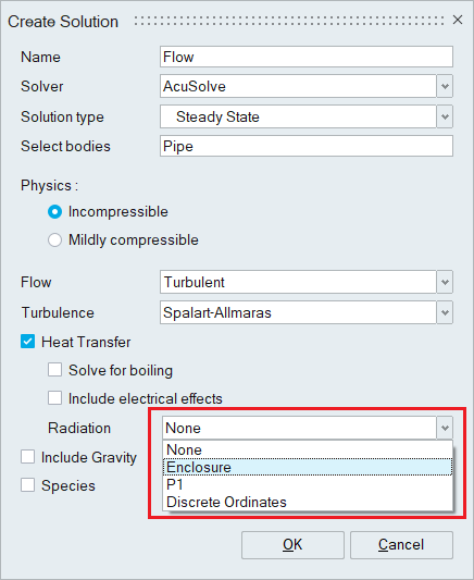 If Heat Transfer option is activated, Radiation option is displayed with the default setting of None. Three different radiation models are supported,