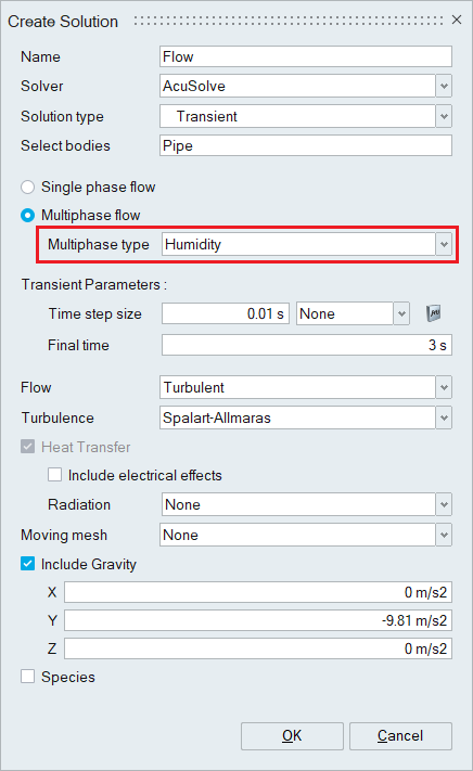 When using the Humidity, solver tracks the spread of “Water vapor” field by solving the field's mass fractions equation in the form of species transport equation in addition to solving the mixture continuity, momentum equations and energy equations.