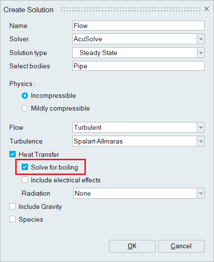 If Solve for boiling is activated, single phase nucleate boiling will be modeled using the popular wall heat transfer model for sub-cooled boiling (Steiner Model). A Vapor phase model is required and needs to be provided during material definition.