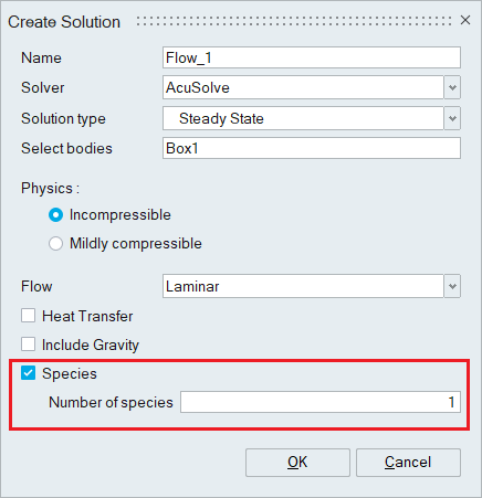 Species are passive scalars that allow to simulate the transport of a scalar quantity. SimLab currently supports up to 9 species. The Species flag enables the solving of passive scalars and Users can define the number of species to be modelled in the simulation.